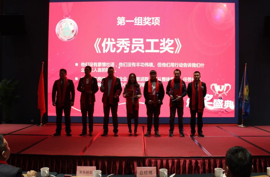 首先颁发的是2017年优秀员工奖:经公司研究决定将授予王林等五位同志2017年优秀员工称号,以表彰他们在2017年为公司所做的贡献和努力,他们没有豪情壮语,他们没有丰功伟业,但他们用行动告诉我们什么是主人翁精神。他们在工作岗位上兢兢业业,锐意进取,服从整体安排,任劳任怨,工作态度诚恳,有上进心,能坚持原则。