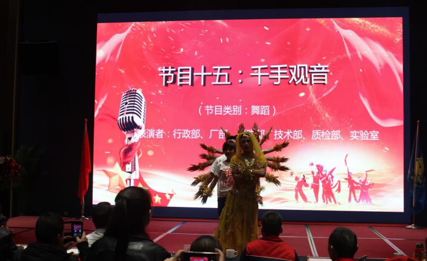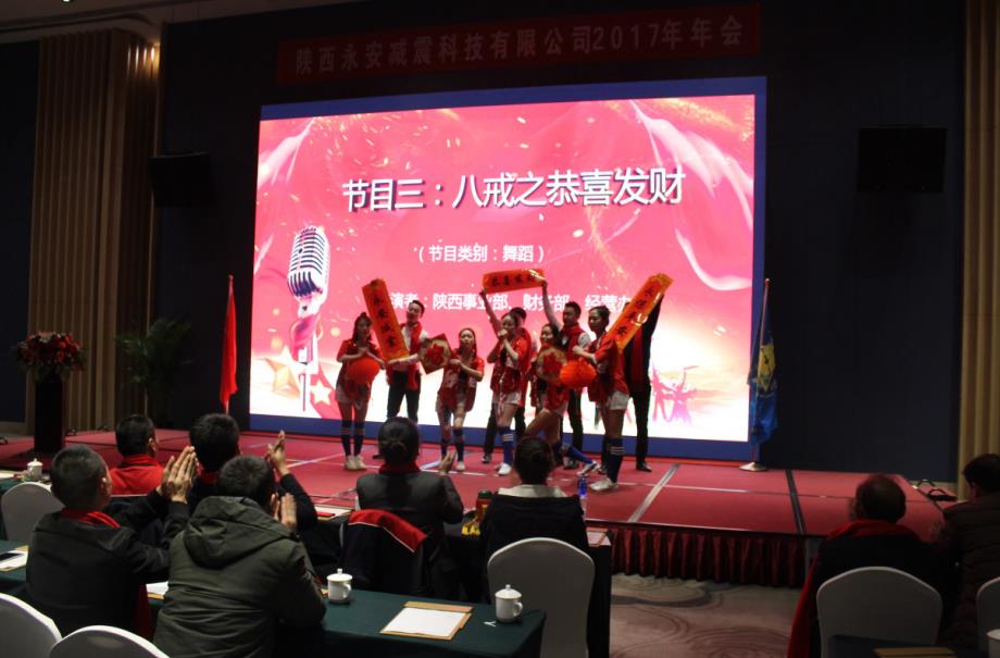 2017年年会,我们不光总结过去,展望未来,表彰优秀,还有公司各个部门精心组织排练的节目表演,既表达了我们对新年的祝福,也体现了我们是相亲相爱的尊龙凯时减震一家人。整个文艺汇演,由董事长兼总经理李剑先生、常务副总张晓博先生携各事业部和生产部负责人的一首集体大合唱《强军战歌》拉开了序幕,随后小品、舞蹈、舞台剧等表演形式热闹非凡,赢得了阵阵掌声。最后,为了感谢各部门带来的精彩节目,经年会组委会认真评选,陕西事业部、财务部、经营办的舞蹈《八戒之恭喜发财》赢得本次年会的一等奖,行政部、厂部、采购部、技术部、质检部、实验室的组合舞蹈《千手观音》获得了二等奖,新市场开发部带来的《诗朗诵》获得了三等奖,车间员工自编自演的小品《有钱了》获得了特别活力奖。